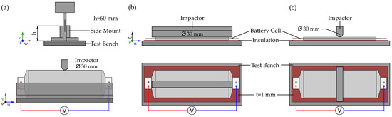 Quasistatic loading experiments were conducted on the hydraulic press PRESTO 420, designed to achieve a maximum load of 420 kN with cross-head speeds residing in the range of mm/s– mm/s. For cylindrical indentation tests (Figure 2b,c), the test specimens were placed on top of a 1 mm thick isolating Pertinax® plate (Kaindl, HP2061) on the movable lower plate of the press. The upward movement of the lower press plate was realized via four guidance rails, positioned symmetrically in the corners of the testing chamber in order to avoid tilting of the plate during movement. Displacement data was recorded by a high-precision linear glass scale encoder with an accuracy of 1 m. A cylindrical indenter with a diameter of 30 mm was mounted perpendicular over the long side of the cell as shown in Figure 2b. The battery sample was deformed with a testing velocity of 1 mm/s. Electrical cell failure, characterised by an ISC, was defined as the criterion of test termination. In the case of lateral indentation (Figure 2a), the test termination criterion was set to 25 mm of displacement after contact between cell and test stamp or if cell failure is detected. Thus, a maximum cell deformation of approximately 40% of the unclamped cell width was achieved. Testing speed for this test case remained unchanged at 1 mm/s with respect to the aforementioned cylindrical indentation tests. The force during quasistatic tests was logged via a NI-9237 bridge input module with a resolution of 24 bits and a sample rate of 50 kS/s using a load cell of the type GTM Serie K 500 kN and a GTM Serie K 20 kN, both of which have an accuracy class of %. The integrated 24-bit NI-9229 voltage input module (0–60 V per channel) measured the voltage signal of the cells during mechanical testing. Data acquisition frequency for all measured signals was set to 1 kHz [25,27].
