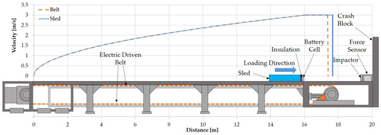 The ELLMAR test rig (see Figure 3), especially designed for dynamic battery experiments at arbitrary SOC levels, was used in this work to conduct high-speed dynamic impact tests with a velocity of 3000 mm/s. Here, the cell and the underlying isolating Pertinax® plate (Kaindl, HP2061), were fixed vertically on a 85 kg horizontal ball bearing guided steel sled, which was next accelerated by an electric driven belt within a 16 m long acceleration section. The above mentioned sled mass was chosen in order to achieve cell failure with a constant velocity during impact. After reaching the constant target velocity at the end of the acceleration section, the sled decoupled from the belt and hit a 30 mm cylindrical impactor, mounted directly on top of a load cell. The resulting force signal was measured by a KISTLER Z20730 piezoelectric load cell with 500 kN nominal force and a sampling rate of 100 kHz. Sled displacement was recorded by a SIKO MSC500 high-precision magnetic sensor, characterized by a resolution of 1 m and an accuracy of ±5 m. Cell voltage was measured during all dynamic tests with a Dewetron DAQP-STG module with a sampling rate of 100 kHz and a voltage input accuracy of ±0.05%.