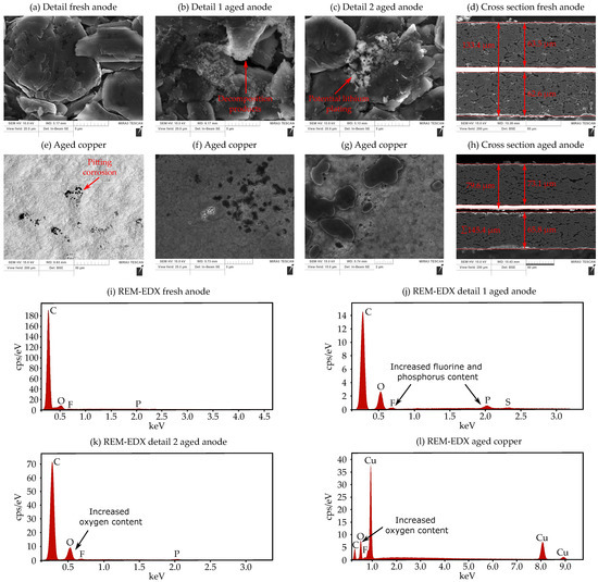 Analyzing the electrical aging mechanisms at the anode of the investigated lithium-ion cell with SEM-EDX: (a) Surface image of the fresh anode. (b) First conspicous detail of the aged anode showing decomposition products. (c) Second conspicous detail of the aged anode indicating lithium-plating. (d) Cross section image and thickness measurement of the fresh anode. (e–g) Surface images of the aged copper current collector with pitting corrosion effects. (h) Cross section image and thickness measurement of the aged anode. (i) SEM-EDX analysis of the fresh graphite anode. (j,k) SEM-EDX analysis of the first and second conspicous spot of the aged anode. (l) SEM-EDX analysis of the aged copper current collector.