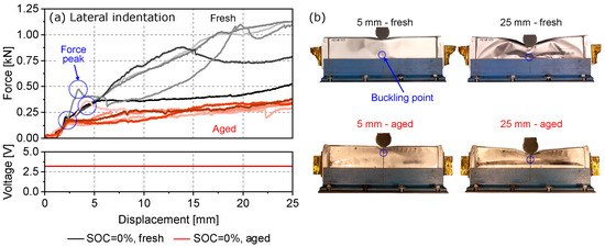 Comparison of the lateral indentation test results between fresh and aged lithium-ion cells: (a) shows the measured results of force and electrical voltage. (b) shows the buckling behavior of fresh and aged cells at 5 mm and 25 mm displacement.