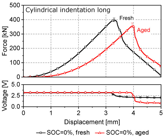 The stiffness S of the aged cells, defined as the slope of the linear region in the force-displacement curves in the range between 150 kN–300 kN, decreased about % after cell cycling. The reason for this effect is the formation of a more elastic SEI layer at the outer section [31], which when initially compressed softens the overall mechanical response of the cell. An important issue, having a high priority in the safety assessment of electrically aged cells, is the electrical voltage drop, indicating the occurrence of an ISC inside the cell. In the case of cylindrical indentation over the long cell side a simultaneous force and voltage drop could be identified, as often seen in literature [27,32,33]. In this study a deeper voltage drop of approximately 50% for aged cells was observed compared to fresh cells, which can be also explained by the loss of mechanical strength of the investigated cell’s separator observed by Sprenger et al. [27]. Due to the separator’s lower mechanical strength, a higher number of separator layers may have failed, which led to the deeper voltage drop. Similar effects for aged cells were also reported for aged cells in several publications [26,27,28].