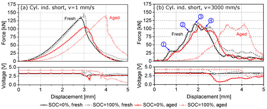 Comparison of the cylindrical indentation test results along the short cell side for fresh and electrical aged lithium-ion cells: (a) Quasistatic results at v = 1 mm/s by Sprenger et al. [27] and (b) dynamic results at v = 3000 mm/s.