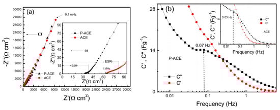 Furthermore, the frequency dependence of the real (Z′) and imaginary (Z″) parts of impedance have been used to obtain the real and imaginary components of capacitance, i.e., (C′ = and (C″ = ), respectively []. The C″-ω curve exhibits a relaxation peak attributed to a relaxation time ) for ions to cross the electrode–electrolyte interface and reach the pores of the activated carbon []. At this peak, the real component of the capacitance (C′) exhibits an inflection. For the cell with the ACE and P-ACE electrodes, C′ and C″ vs. frequency are plotted in Figure 3b and its inset, respectively. The cell with P-ACE exhibited a higher relaxation frequency and thus a relatively smaller relaxation time (~14 s) in comparison to that of the cell with the P-ACE electrodes (~33 s). These results strongly suggest that the polymer addition in the electrode enabled a faster relaxation process.