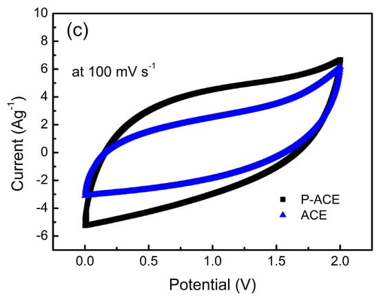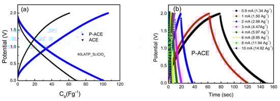 Figure 4a illustrates the GCD profiles for the cells with the ACE and P-ACE electrodes at a constant current of 1mA (~1.5 Ag−1). A relatively longer discharge time was seen for the ASSCs with the P-ACE electrodes. The charge–discharge curves show an almost symmetric nature, although with a slight curvature. These suggest a predominant contribution of an electric double layer at the interface, with some possibility of a pseudo-capacitive mechanism of charge storage []. Evidently, the presence of polymer in the electrode matrix improved the specific capacitance (Cs) notably.