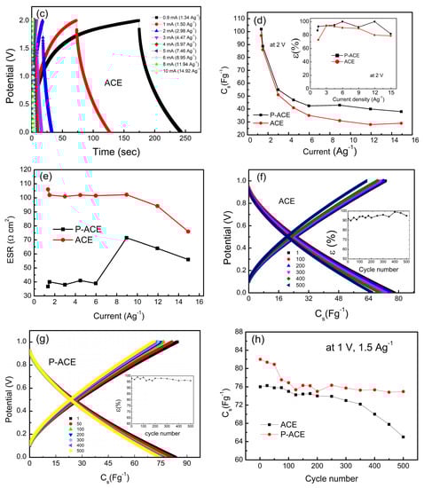 GCD cycles (a) for different electrode compositions, (b) for cells with P-ACE at 1.5 Ag−1, 2 V, (c) for cells with ACEs at different current densities ranging from 0.9 mA (1.34 Ag−1) to 10 mA (14.92 Ag−1). (d) The Cs variation with discharge current. Inset of (d) shows the coulombic efficiency versus current density. (e) ESR versus discharge currents. (f) GCD scans for cells and ACEs with coulombic efficiency vs cycle number in the inset. (g) GCD scans for cells with P-ACEs, coulombic efficiency vs cycle number in the inset. (h) Specific capacitance as a function of the cycle number for cells with ACE and P-ACE electrodes.
