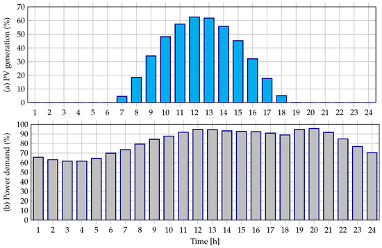 Figure 2a depicts the power generation of an average day for a distribution network located in the metropolitan area of Medellín. To obtain these PV power generation data, a PV polycrystalline silicon panel was taken into account. This type of panel is very common around the world [,], and, in this case, it was especially adapted for Colombia. The PV parameters reported for these PV panels are the following: (1 W), (95%), (1000 W/m), (C), d (25 °C), (46 °C), (800 W/m, (20 °C), , and (0.9). Furthermore, in this work, the average solar radiation and environmental temperature values were considered as reported in []. These values, in addition to the power generation behavior of this PV system in Medellín, are outlined in Table 1: the hour under analysis, the average daily solar radiation , the environmental temperature , and the power generation in p.u., which was obtained via Equation (15).