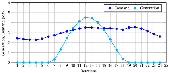 Note that the scope of this research does not include the possible uncertainties in PV generation and demand, which are considered to be well-known inputs for the NLP model that represents the EMS system. Nevertheless, more research is required regarding the stochastic nature of the demand profile and generation input as a function of the weather conditions and the type of the day under analysis (working day or weekend). In addition, the main difference of the current proposal with respect to the convex approximation proposed by the authors of [] is that, in this research, the McCormick approximation is recursively evaluated to minimize the error induced by the approximation of the product of two variables while using a linear equivalent approximation, which was not implemented by the mixed-integer quadratic approximation employed in [] for the efficient integration of dispersed generation sources and BESS systems in monopolar DC networks.