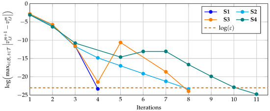 Now, to illustrate the effect of the recursive approximation on the minimization of the error induced by the McCormick approximation in the power balance constraints, as presented in Figure 1, the logarithmic value of the error in (14) is presented in Figure 5.