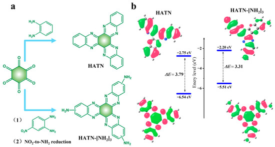 (a) Schematic illustration for the synthesis of HATN-[NH2]3 and HATN. The synthesis of HATN-[NH2]3 includes two steps: (1) the reactant of 4-Nitro-o-phenylenediamine and HKH, and (2) the NO2-to-NH2 reduction. (b) Molecular structures and HOMO/LUMO energy levels of HATN-[NH2]3 and HATN.
