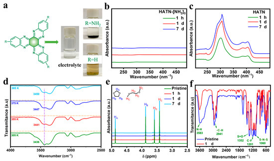 The solubility characterization of HATN-[NH2]3 and HATN in the electrolyte. (a) Digital photos of HATN-[NH2]3 and HATN in the electrolyte. (b,c) UV-vis spectra of the electrolytes after soaking by HATN-[NH2]3 and HATN for different time intervals, respectively. (d) Temperature-dependent in-situ FTIR spectra of HATN-[NH2]3. (e) 1H NMR and (f) FT−IR spectra of the electrolytes soaked by HATN-[NH2]3 for different time intervals (pristine: freshly prepared active materials without any treatment).