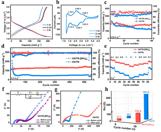 Figure 3e shows the rate capabilities of two HATN-based electrodes. The capacities of HATN-[NH2]3 electrodes are 148, 133, 126, 115, and 105 mAh g−1 at various current densities of 0.1, 0.3, 0.5, 1, and 2 A g−1, respectively. The rate performance of the HATN-[NH2]3 electrodes is also obviously better than that of the HATN electrode. The rate performance was mainly affected by charge and solid-state ion transport resistances of electrode materials. The EIS was performed to study the charge and ion transport properties, and the test data were fitted by an equivalent circuit diagram (Figure 3f,g) [41,42]. The fitting data showed that the charge transfer resistance (Rct) of both cathodes increased after cycling. Notably, the HATN-[NH2]3 cathodes always showed smaller charge transfer resistance than the HATN cathodes (Figure 3h), indicating its quicker charge transfer ability. The Warburg impedance is expressed by the Warburg coefficient (σ), which is the slope of the Z’∼ ω−1/2 line obtained from the Z’ ∼ ω−1/2 plot (ω = 2πf) in Figure S16 [43]. The σ of HATN-[NH2]3 after 10 cycles is calculated to be 52.66 Ω s−1/2, which is the same as the σ of the pristine HATN-[NH2]3 (58.68 Ω s−1/2). However, the σ of HATN after 10 cycles is calculated to be 2335.97 Ω s−1/2, which is obviously higher than that of the fresh HATN (754.81 Ω s−1/2). This indicates that the HATN-[NH2]3 cathodes have better lithium ion diffusion and stability than HATN during cycling, which is attributed to the good chemical stability of HATN-[NH2]3. Benefiting from low Rct and higher stable structure in the electrolyte, HATN-[NH2]3 electrodes achieved long-term cycle life and excellent rate capacity, indicating the key role of amino groups in boosting the electrochemical performance for HATN-based cathode. In view of the above excellent electrochemical performance, the HATN-[NH2]3 is a promising candidate as cathode material for commercial LIBs due to its cost-effective and mature preparation of organic molecules, simple electrode processing procedures with combinability of current industrial technology for battery manufacturing.