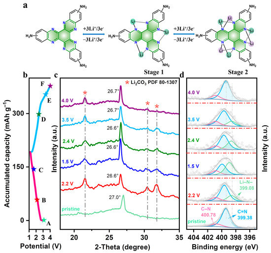 (a) The configurations of HATN-[NH2]3, Li3HATN-[NH2]3, Li6HATN-[NH2]3. (b) The initial galvanostatic discharge and charge curves of HATN-[NH2]3 electrodes with marked points at diverse discharge and recharge states at 50 mA g−1. (c) Ex-situ XRD patterns and (d) ex-situ high-resolution XPS N 1s spectra for the samples taken at different states as marked by a pristine, 2.2 V discharged, 1.5 V discharged, 2.4 V charged, 3.5 V charged, 4.0 V charged in (b). (pristine: freshly prepared electrode sheets without any treatment).