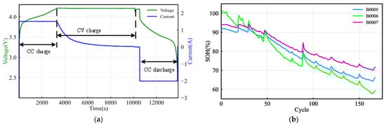 The NASA battery datasets, regarding several commercially available lithium-ion 18 650-sized rechargeable batteries, was collected from a battery prognostics test bed. The test bed setup included a power supply, a programmable load, a voltmeter, a thermocouple sensor, and an environmental chamber to regulate and stabilize the temperature []. Among the six battery datasets, the first dataset includes three batteries (labeled B0005, B0006, and B0007) considered suitable for this battery state of health estimation study. This set of cells was run through three operational profiles (charge, discharge, and impedance) at room temperature. As is shown in Figure 1a, the charge was carried out in a constant current–constant voltage (CC–CV) mode where the constant current was 1.5 A, the voltage was 4.2 V, and the constant voltage (CV) mode continued until the charging current dropped to 20 mA. Discharge was carried out at a constant current (CC) level of 2 A until the voltage fell to 2.7 V, 2.5 V, and 2.2 V for batteries B0005, B0006, and B0007, respectively. The charge/discharge cycle was repeated to accelerate the aging until the batteries reached their end-of-life (EOF) criterion of a 30% reduction in rated capacity (from 2 Ah to 1.4 Ah), and all the SOH degradation curves are shown in Figure 1b.