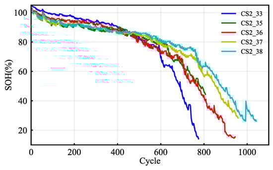 The second battery dataset, from the Center for Advanced Life Cycle Engineering (CALCE) at the University of Maryland, was obtained from the implementation of cyclic battery testing on the Arbin200 battery testing system at room temperature. Specifically, we employ a set of five CS2 cells labeled CS2-33, CS2-35, CS2-36, CS2-37, and CS2-38 to verify the effectiveness of the LSTM-RNN estimating model. Each cell underwent the same CC–CV charging mode in which the constant current rate was 0.5 C (this indicates that the charging current was 0.55 A), and the constant voltage was sustained at 4.2 V until the charge current fell below 0.05 A. As for the discharge process, CS2-33 was cycled with a constant discharge current of 0.55 A, which indicates that the discharge current rate was 0.5 C. The rest of the cells (CS2-35, CS2-36, CS2-37, and CS2-38) were discharged with a constant current rate of 1 C. The materials of the cells consisted of graphite on the anode and LiCoO2 on the cathode. Figure 2 represents the SOH degradation curves of all the batteries whose nominal capacity is 1.1 Ah.