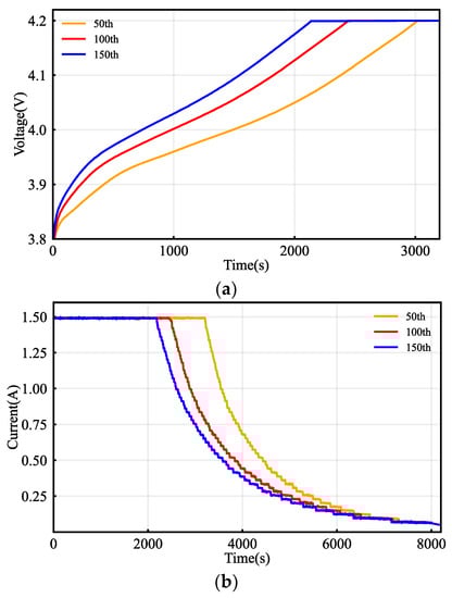 (a) Charge voltage curves from 3.8 V to 4.2 V during different cycles; (b) current curves during the whole charging process during different cycles.