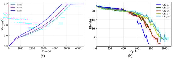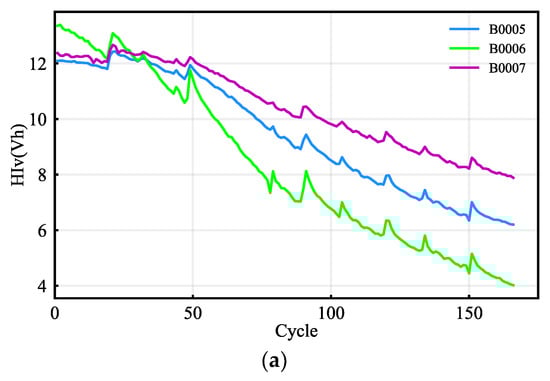 where v(t) represents the terminal voltage function versus time, and t0 and t1 denote the moments at which the voltage equals 3.8 V and 4.2 V, respectively. The plots of HIv values versus the cycles for different cells from the NASA repository are represented in Figure 4a.