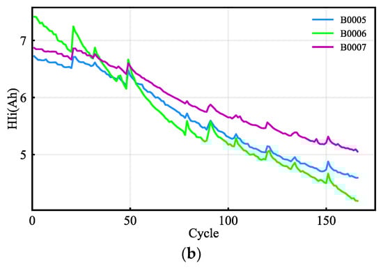 where i(t) represents the corresponding charge current, and t0 and t1 denote the charge start and end moments, respectively. The HIi curves for different cells from the NASA repository are shown in Figure 4b.