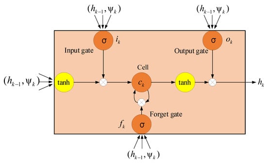Figure 6 schematically illustrates the network architecture of LSTM-RNN, which can work as a nonlinear dynamic system by mapping input vectors to output sequences. The LSTM cell is equipped with a memory cell ck, which is the key part of the structure and stores the long-term dependencies. In addition, the input, output, and forget gates are distinctive features of the LSTM-RNN and can regulate the information flow. Each gate is a sigmoid unit (σ) that is activated from the hidden layer at the last time step hk−1 and from the present input layer ψk. The constructed LSTM-RNN can be represented by the composite function below: