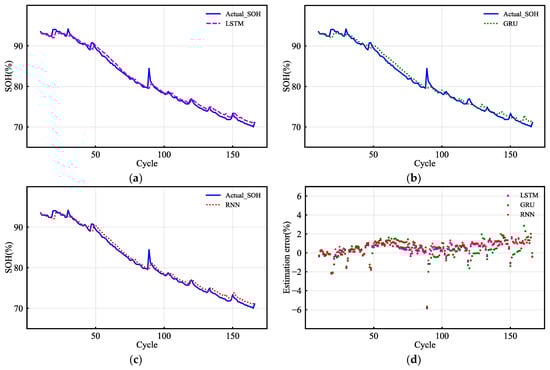 (a) SOH estimation results of the LSTM-RNN; (b) SOH estimation results of the GRU-RNN; (c) SOH estimation results of the Sim-RNN; (d) estimation errors of the LSTM-RNN, Sim-RNN, and GRU-RNN.