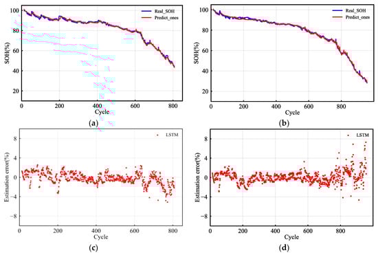 Figure 10 shows the estimation performance on batteries CS2-35 and CS2-37, which underwent the 1 C discharging rate. Figure 10a,b represent the corresponding SOH estimation results for batteries CS2-35 and CS2-37. The overall RMSE achieved on the two batteries is 0.9311% and 0.8288%, respectively. The overall RMSE and MAE performance metrics for batteries CS2-35 and CS2-37 are listed in Table 3. Moreover, the estimation errors of each cycle for the two testing cases are plotted in Figure 10c,d, and the errors mainly stay within 3%. Specifically, the estimation root mean square errors above 80% SOH (safe battery operating range) generally fall within 2% and are smaller than those estimated in the final phase. Moreover, the SOH estimation results from the LSTM-RNN eliminate the impact of the input noise from the HIv extraction process shown in Figure 5b.