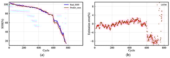 To evaluate the robustness of the trained LSTM-RNN model against different discharging current rates, battery CS2-33, which underwent a 0.5 C discharging rate, was used to validate the estimator. Figure 11a,b show the estimation results and the estimation errors of each cycle, respectively. The SOH estimations above 80% SOH are close to the actual values at different cycles, and the corresponding estimation errors are almost within 3%. However, the SOH estimation errors of the LSTM-RNN model are relatively large for the cycles in which the SOH is below 80%. The overall RMSE of the estimation result for battery CS2-33 is 2.0384%, and the MAE is 1.495%, as listed in Table 3. Since lithium-ion batteries generally operate within a certain range for a safety, evaluating the estimator performance above 80% SOH is more practical and critical. Table 4 shows that the overall RMSE of the estimation results above 80% SOH for the battery CS2-33 is 1.1198%, and the MAE 0.9454%, a result approaching the estimation performance of the developed LSTM-RNN for batteries CS2-35 and CS2-37, which means that the trained LSTM network possesses a certain degree of robustness against the different discharging current rates.