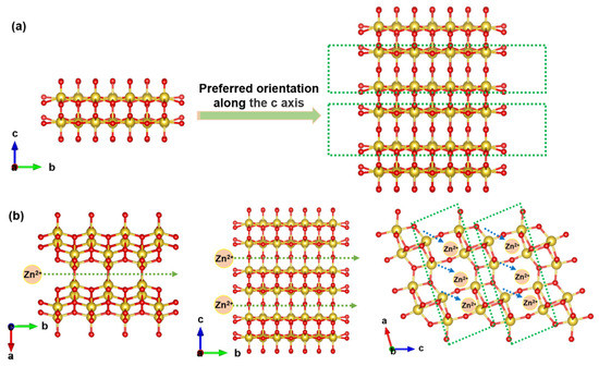 (a) Crystal structure of PO-VO2 nanosheets with preferred orientation along the c-axis. (b) Schematic illustration of the zinc ion transmission pathway along the interlamination direction.
