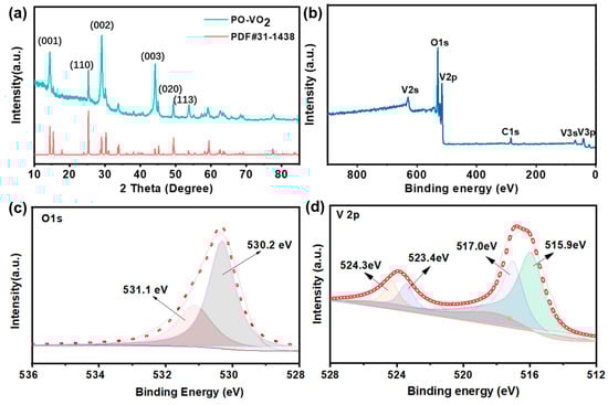 (a) The XRD pattern of the PO-VO2 nanosheet; (b) the XPS survey spectrum; (c) the O 1s and (d) V 2p spectrum of the PO-VO2 nanosheet.