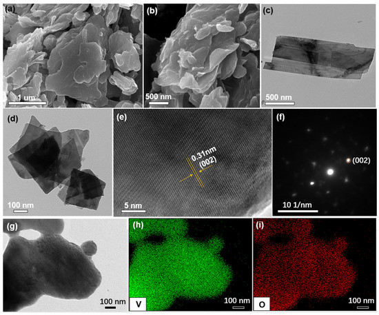 The morphology of VO2 2D-nanosheets: (a,b) SEM images; (c,d) TEM images; (e) HR-TEM image; (f) SAED pattern; (g–i) TEM image and corresponding element mappings of V and O.