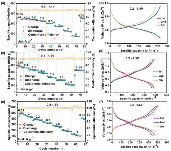 The electrochemical performance of PO-VO2//Zn batteries: (a,b) the rate performance at different current densities and corresponding galvanostatic charge-discharge curves in the voltage of 0.2–1.4 V; (c,d) the rate performance at different current densities and corresponding galvanostatic charge-discharge curves in the voltage of 0.2–1.5 V; (e,f) the rate performance at different current densities and corresponding galvanostatic charge-discharge curves in the voltage of 0.2–1.6 V.