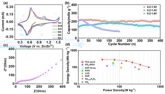 (a) The first several cycle CV curves of PO-VO2//Zn batteries at a voltage of 0.2–1.5 V; (b) the cycling performance at a current density of 1 A g−1 under the different voltage range; (c) the EIS plot at 0.01–106 Hz; (d) comparison of the energy density and power density of the VO2//Zn battery with reported ZIBs based on different electrodes.