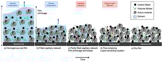 Studies have revealed that a small variation in drying conditions, such as temperature and air velocity, controls the solvent evaporation and dictates the final structure of the electrode. The major structural changes includes the crack formation [,] and binder migration [,,]. These electrode quality parameters determine the electrode’s mechanical strength, and eventually, the specific discharge capacity and capacity loss [].