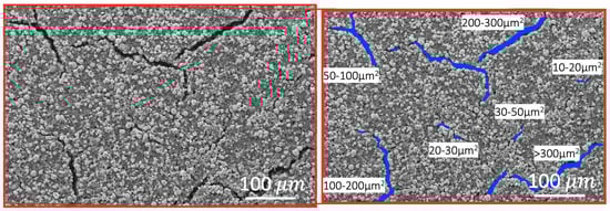 Some studies have analyzed the electrode’s surface crack size as a quality measurement to understand its influence on the mechanical and electrochemical performance []. For example, Rollag et al. [] studied the crack formation of aqueous processed cathodes with extensive cracks (80,000 μm) and neglected the small voids <10 μm. However, few studies have quantitatively investigated the effect of small crack sizes (<1400 μm) and classified them according to the length and width for NMP-processed NMC cathodes with low mass loading (<6 mg/cm). It is important to determine the minimal crack size at which cracking starts having a positive influence on the porosity and Li-diffusion, as this can potentially allow for a higher capacity when increasing the charge/discharge currents.