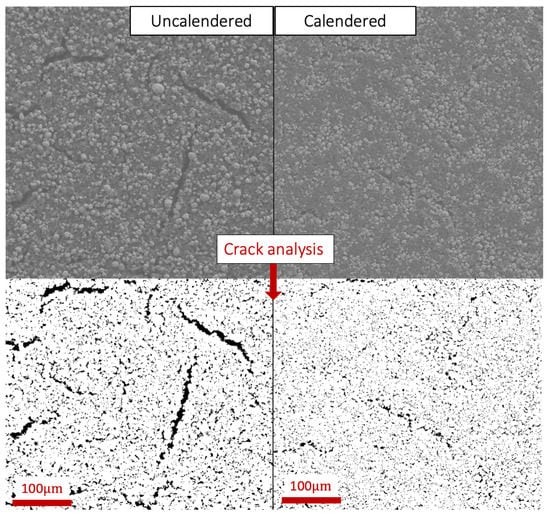 The SEM analysis of the surface of uncalendered and calendered cathodes, and the converted image used for crack analysis in ImageJ.