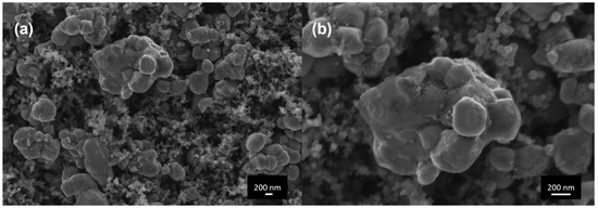 FESEM micrographs of the cathode electrodes (a) 50 kX and (b) 100 kX.