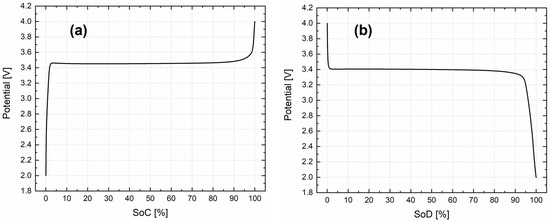 Since a polarization phenomenon was observed between charge and discharge curve during the measurements, and because of the importance of the parameter described, both charge and discharge OCV curves were implemented inside the developed electrochemical model. Looking at Figure 2a,b, respectively, for charge and discharge, the polarization phenomenon, as mentioned, can be clearly identified. Considering, for both curves, an SoC equal to 50%, a non-negligible difference of 50 mV between the charge and the discharge equilibrium voltage was calculated. In fact, considering only a charge or discharge OCV curve inside the electrochemical model for charge–discharge cycles will result in a percentage error of around 1.45% and 1.47% in the plateau region for charge (3.45 vs. Li/Li+) and discharge (3.40 vs. Li/Li+), respectively.