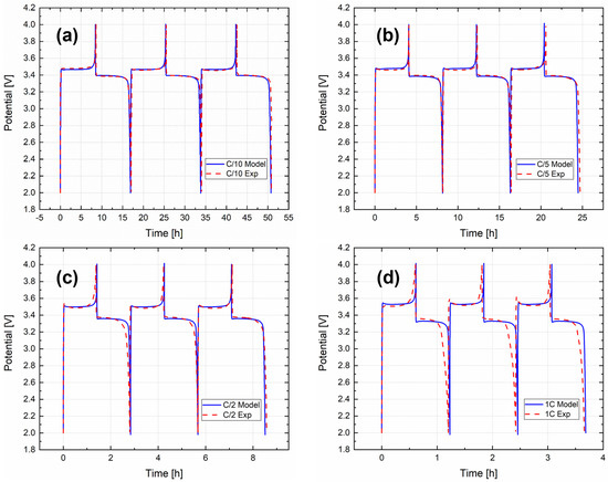Successively, electrochemical model validation was performed to prove the consistency and robustness of the calibration of the P2D model at different C rates from the one chosen for the calibration (C/20). Therefore, the electrochemical model validation was achieved comparing charge–discharge curves of the first three experimental cycles with the simulated ones. Since four different C rates were considered for the validation (C/10, C/5, C/2, 1C), the charge–discharge current in the model was coherently modified for each C rate. Figure 4 shows a comparison at (a) C/10, (b) C/5, (c) C/2 and (d) 1C. It can be stated that all the simulated curves fit the experimental results well, both for the voltage behaviour and for the required experimental charge–discharge times. The errors between the experimentally obtained capacities and the ones obtained from the model were calculated and are reported in Table S1. All values are below 2.5%, confirming the strength of the model.