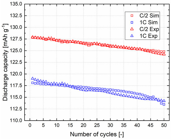 Once the electrochemical model was validated, the aging model calibration was performed. In order to see the effect of the implementation of the SEI growth on the surface of metallic lithium, it was necessary to simulate the experimental loss in discharge capacity for a high number of charge–discharge cycles (in this case, fixed equal to 50). The parameters in Equation (18) were modified in order to improve the fitting between the simulated discharge capacities and the experimental ones, at a fixed calibration C rate, equal to C/2. After the aging calibration, the P2D aging model was validated at 1C. Charge–discharge currents were coherently changed due to the different C rates, and the capacity loss for 50 cycles was simulated. In Figure 5, a comparison between the simulated and experimental discharge capacities for 50 cycles at C/2 and 1C is shown, and the corresponding numerical values are reported in Table S2.