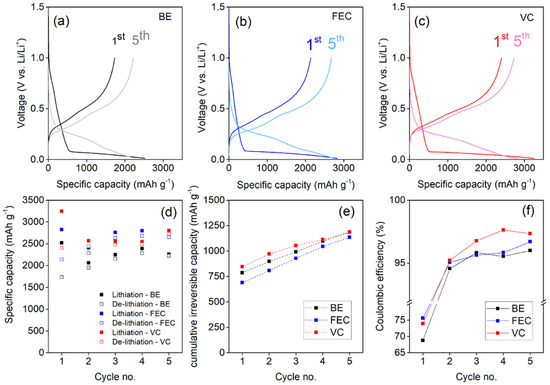 Discharge–charge cycling performance of Si NW electrodes at 0.2 C using: (a) the BE electrolyte; (b) the FEC added electrolyte; (c) the VC added electrolyte. (d) Specific capacity, (e) cumulative irreversible capacities in the first 5 cycles and (f) coulombic efficiencies.