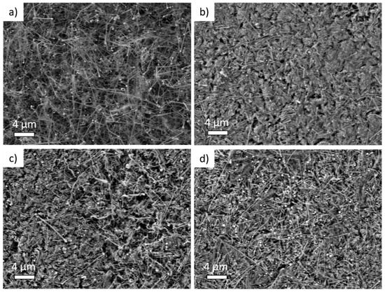 The nanowire morphologyis observed in the pristine Si NW sample (Figure 2a and Figure S1), with a Sn-seed of~100 nm diameter atop Si NWs several microns in length [45,48,49]. In contrast, postmortemelectrodes cycled in the BE electrolyte (Figure 2b and Figure S1) show the occurrence of a massive alteration of the overall morphology. The Si NWs are tangled and embedded in an amorphous-like matrix, likely constituted by organic by-products of the electrolyte degradation.Conversely, the morphology is better preserved in electrodes cycled in electrolytes with additives (Figure 2c,d). Both FEC- and VC-added electrolytes induce a better morphological retention of the nanowires shapewith expansion of the diameter upon cycling. At lower and higher magnifications, electrodes are rather homogeneous (see Figures S1 and S2 of Supplementary Materials). In all cases, surfaces and nanowires are covered with an amorphous-like matrix that is more compact and denser in the electrodes cycled with the BE electrolyte.