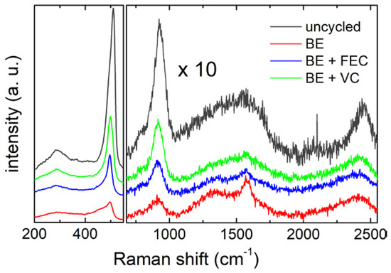 In the low frequency region (200 cm−1–550 cm−1), the characteristic peaks of silicon nanowires are visible. In particular, the strong broad peak around 500 cm−1 contains phonon modes of amorphous and crystalline silicon, i.e., the crystalline TO mode (c-TO) at ≈514 cm−1, and the amorphous TO mode (a-TO) and LO mode (a-LO) at ≈495 cm−1 and 480 cm−1, respectively [50,51]. The weak band centeredon 290 cm−1 can be assigned to the 2TA phonon mode of the amorphous silicon [49]. Focusing in the region between 720 cm−1 and 2250 cm−1, it is possible to observe, besides the silicon overtone mode 2TO (at ≈925 cm−1) [52], the characteristic Raman bands of carbon films (1200–1600 cm−1, 2450 cm−1) [53,54,55]. The carbon G and D bands in the range 1200–1600 cm−1 are clearly distinguishable in the samples cycled without additives and with FEC (red and blue spectra in Figure 3, respectively), while they are less pronounced in the VC cycled sample (green spectrum) and in the uncycled one (dark grey spectrum). Carbon signals in the uncycled sample can be due to the synthesis residues of the carbon-containing precursor (squalene), possibly also inducing the local formation of SiC, as also suggested by the shoulder detected at about 790 cm−1 [56]. It is important to mention that the crystallinity of the pristine silicon sample has been already demonstrated by some of us by X-ray diffraction as reported in ref. [15].