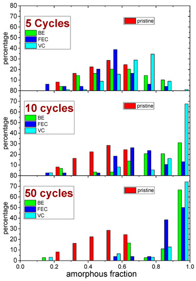 An inhomogeneous distribution of the amorphous fraction inside each map was observed (the statistical distributions obtained after 5, 10 and 50 cycles are reported in Figure 6).