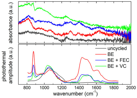 The normalized spectra (see Figure 7) indicate that the postmortemsamples collected from BE electrolyte without additives show the highest content of carbonates (1400–1600 cm−1) and LiPF6 decomposition products (870 cm−1). On the other hand, Si NW electrodes cycled with FEC and VC show similar carbonate content but a different content of LiPF6 decomposition residues that is higher for the samples cycled with the FEC-added electrolyte. In summary, Raman, ATR-FTIR and O-PTIR spectroscopies disclose a complex scenario. The Si NW electrodes cycled, without additives, with FEC and VC show different features in terms of silicon amorphization and SEI composition after cycling as summarized in Table 3.