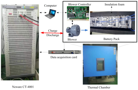 To validate the model and study the temperature control performance of the BTMS, an experimental setup, as shown in Figure 1, was built. The battery pack and thermal management system are placed in the thermal chamber. The battery charging and discharging are controlled by the battery test equipment (Neware CT-4001, manufactured in China). Meanwhile, the total voltage and current of the battery pack can also be collected using the battery test equipment. The temperature is collected by the data acquisition card and then transmitted to the computer through the network cable for recording. A commercial blower for a vehicle is adopted, whose speed can be controlled by the blower controller. The computer can communicate with the blower controller by controller area network (CAN). The temperature control range of the thermal chamber is +10 °C–85 °C, and the temperature deviation is ±2 °C. The voltage measurement range of the battery test equipment is 0–50 V, and the current measurement range is 0–150 A. The accuracy of the current measurement is 0.1% of the full range, and that of the voltage measurement is 0.1% of the full range. A data acquisition card can provide 8-channel temperature acquisition, and 5 k-type thermocouples are adopted to measure temperature, whose temperature accuracy is ±1 °C. The temperature measurement points will be described later.