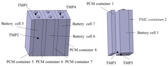 The arrangement of temperature measurement points is very important for the battery management system. The battery management system gets the distribution characteristics of the battery temperature field using these points. However, the arrangement of the temperature measurement points is limited by hardware resources in engineering practice and should be as few as possible. In the experiment setup, it is possible to arrange as many temperature measurement points as possible to obtain the temperature field distribution of the battery. To be consistent with the actual project, this article attempts to use as few temperature measurement points as possible to obtain the battery’s maximum and minimum temperatures. The layout of the temperature measurement points refers to the results of the temperature field distribution from the later numerical simulations. According to the simulation results, the maximum temperature is located in middle battery cell 5 without forced air cooling, while the one located in battery cell 7 is with forced air cooling. The minimum temperature located in battery cell 1 or 10 is without forced air cooling, while that located in battery cell 1 is with forced air cooling. Therefore, battery cell 1 is adopted to monitor the minimum temperature. The final temperature measurement point (TMP) is shown in Figure 3. TMP1, TMP2, and TMP4 monitor the highest temperature, while TMP3 and TMP5 monitor the lowest temperature. The experimental results show that in the case of no forced air cooling, the highest temperature is TMP1, while the one with forced air cooling is TMP4.