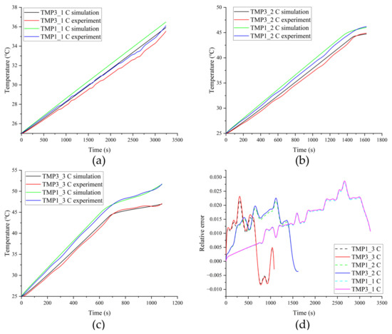 In order to verify the validity of the model, TMP1 and TMP3 are used as representatives, one for TMP1 to collect high temperature and one for TMP3 to collect low temperature. The simulation results and relative errors under different discharge rates are shown in Figure 6a–d. It is observed that the maximum relative error of the model reaches 3% at a 1 C discharge rate. While the accuracy of model relative error is reduced at 2 C and 3 C discharge rates, and the maximum error is below 2.5%. This is due to the large relative error caused by the low-temperature rise and the small measurement temperature range at low discharge rates. Mean Absolute Error (MAE) and Root Mean Square Error (RMSE) are shown in Table 3. In view of the above, the accuracy of the model is acceptable.