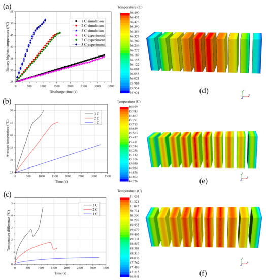 Figure 7a is the temperature rise curve of the battery pack experimentally and simulated at different discharge rates of the finless PCM container. The experimental and simulation temperatures have the same rising trend when discharging. Modeling observations of the maximum temperatures are the same as experimental observations, with a maximum error of 3.19%. Hence, the model can be validated again. Figure 7b shows the average temperature rise curves at discharge rates of 1 C, 2 C, and 3 C, respectively. As can be seen in the figures, with the continuous discharge of batteries, the temperature of the batteries keeps rising, and the temperature curve of 1C discharge does not form a plateau, while temperature curves of 2C and 3C have obvious plateaus. This plateau is caused by a phase change latent heat effect. As can be seen from Figure 7a,b, the maximum surface temperature and average surface temperature of the battery pack at the end of 1 C discharge are only 36.491 °C and 36.265 °C, which are far lower than the phase-change temperature range of 44 °C~46 °C. Therefore, no obvious temperate curve plateau is observed. This is because the heat generated by the battery pack has been absorbed by the sensible heat of the whole heat dissipation system. When the battery temperature is lower than the phase-change temperature, the experimental temperature value is lower than the simulated temperature value, which is mainly because the thermal chamber cannot be completely sealed, and some heat generated by the battery will be transferred to the insulating material and air. When the temperature of the battery is in the temperature plateau, the experimental temperature is higher than the simulation temperature. This is because the thermal conductivity of liquid PCM is lower than that of solid PCM. The thermal conductivity of liquid PCM is set to the thermal conductivity of solid PCM in simulation. The lower thermal conductivity makes it difficult to transfer heat to the interior of the PCM in the experiment, so the temperature plateau in the experiment is higher than that in the simulation. By observing the experimental temperature curve of 1 C in Figure 7a, it can be found that in the later stage of discharge, the heat generation rate of the battery increases significantly due to polarization and internal resistance, and the internal resistance increases with increasing temperature. Thus, the temperature rise rate will increase significantly at this stage. However, there is no obvious tendency to accelerate the temperature rise during 2 C and 3 C discharging. First, they all enter the phase-change zone at a later stage, and the temperature plateau eliminates the effect of accelerated temperature rise. Second, the discharge time is short under a high discharge rate, and the battery stops discharging as soon as the side reaction and polarization reaction are in the initial stage.