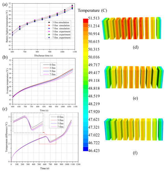 Temperature curve of battery pack with a different number of fins and temperature field of a battery pack with PCM containers which have different quantities of fins. (a) maximum temperature; (b) average temperature; (c) temperature difference (d) 3-fin PCM container; (e) 5-fin PCM container; (f) 7-fin PCM container.