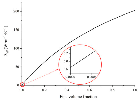 Relationship between effective thermal conductivity and fin volume fraction of PCM container.