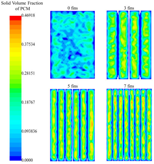 Fins are crucial for PCM container heat transfer. At the discharge end of 3 C, the solid volume fraction of PCM is shown in Figure 11, where the plate is the first plate. The PCM of the plates (2 to 10) was melted completely because the plates (2 to 10) had bad heat transfer conditions. As can be seen in Figure 11, the solid volume fraction increases when the number of fins increases. That means the fins can improve heat transfer performance, and meanwhile, the fluidity became smaller because of the high solid volume fraction. In addition, the solid PCM in the container with zero fins is mainly located between the core and the side of the container. At the same time, the PCM in the core and side is melted more completely. The PCM in the plate with fins is distributed more evenly because of the fins separating. Hence, the liquid phase of PCM has smaller space in the plates with fins, and the PCM structure is more stable.
