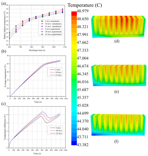 For the BTMS designed in this paper, the maximum temperature of the battery pack can be controlled within 50 °C, and the maximum temperature difference can be controlled within 5 °C under 5 m/s wind speed. When the wind speed is increased, although the maximum temperature on the surface of the battery pack can be reduced, the maximum temperature difference will be increased, and additional energy consumption will be increased. Therefore, the wind speed of 5 m/s is a more suitable choice.